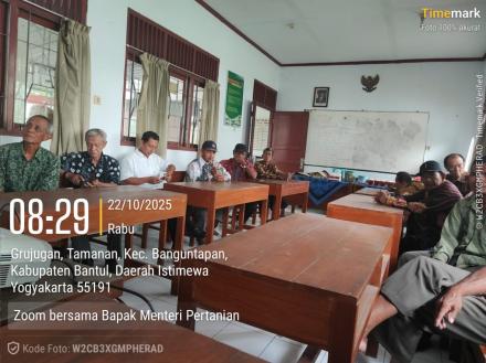 BanguntapanNews - Pemerintah Kalurahan Banguntapan bersama Gabungan Kelompok Tani (Gapoktan) Banguntapan mengikuti kegiatan Zoom Meeting bersama Menteri Pertanian Republik Indonesia yang diselenggarakan oleh Balai Penyuluhan Pertanian (BPP) Kapanewon Banguntapan.