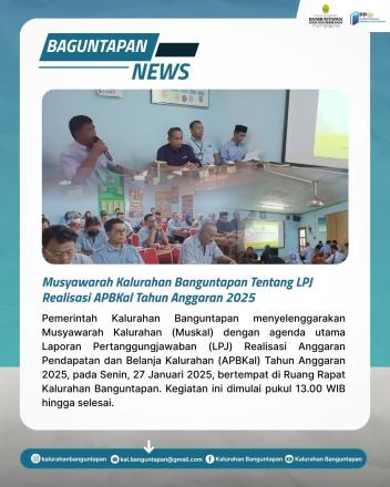 Banguntapan, 28 Januari 2026 — Pemerintah Kalurahan Banguntapan menyelenggarakan Musyawarah Kalurahan (Muskal) dengan agenda utama Laporan Pertanggungjawaban (LPJ) Realisasi Anggaran Pendapatan dan Belanja Kalurahan (APBKal) Tahun Anggaran 2025, pada Senin, 27 Januari 2026, bertempat di Balai Kalurahan Banguntapan. Kegiatan ini dimulai pukul 13.00 WIB hingga selesai.