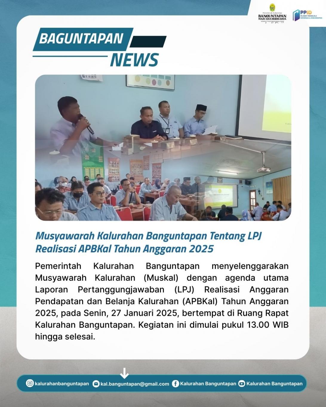 Muskal tersebut merupakan forum resmi yang menjadi bagian dari mekanisme pemerintahan desa dalam rangka mewujudkan transparansi, akuntabilitas, serta partisipasi masyarakat dalam pengelolaan keuangan kalurahan. Kegiatan dihadiri oleh Lurah Banguntapan beserta jajaran pamong kalurahan, Badan Musyawarah Kalurahan (Bamuskal), lembaga kemasyarakatan kalurahan, tokoh masyarakat, serta unsur pendamping desa.