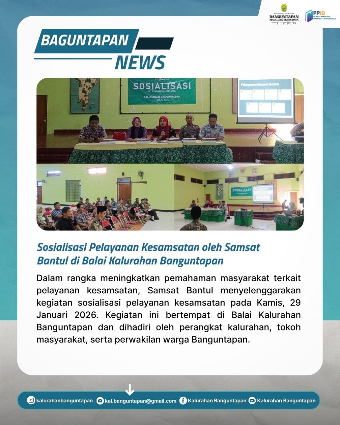 Banguntapan, 29 Januari 2026— Dalam rangka meningkatkan pemahaman masyarakat terkait pelayanan kesamsatan, Samsat Bantul menyelenggarakan kegiatan sosialisasi pelayanan kesamsatan pada Kamis, 29 Januari 2026. Kegiatan ini bertempat di Balai Kalurahan Banguntapan dan dihadiri oleh perangkat kalurahan, tokoh masyarakat, serta perwakilan warga Banguntapan.