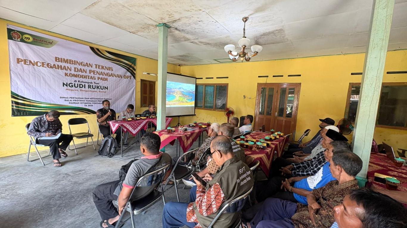 Banguntapan – Kelompok Tani Ngudi Rukun melaksanakan kegiatan Bimbingan Teknis (Bimtek) Pencegahan dan Penanganan Organisme Pengganggu Tumbuhan (OPT) Komoditas Padi pada Jumat (10/04/2026).